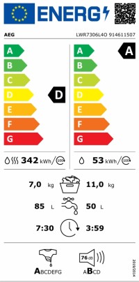 - Classe de eficiência energética do ciclo de lavagem/secagem (Regulamento (UE) 2017/1369): D
